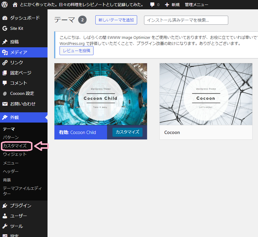 ダッシュボードの「テーマ」➡「カスタマイズ」