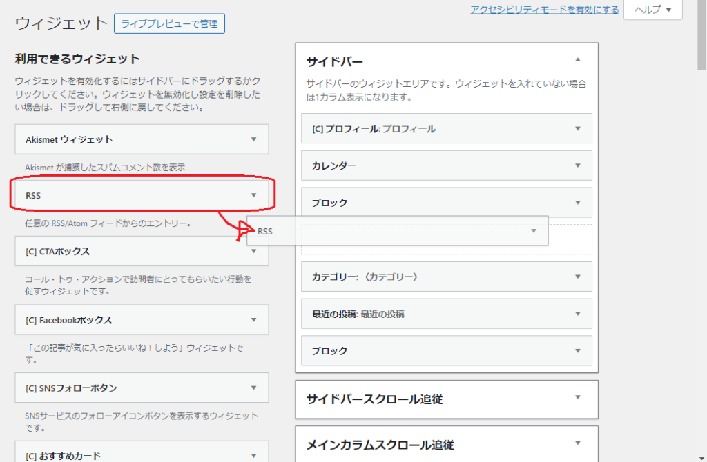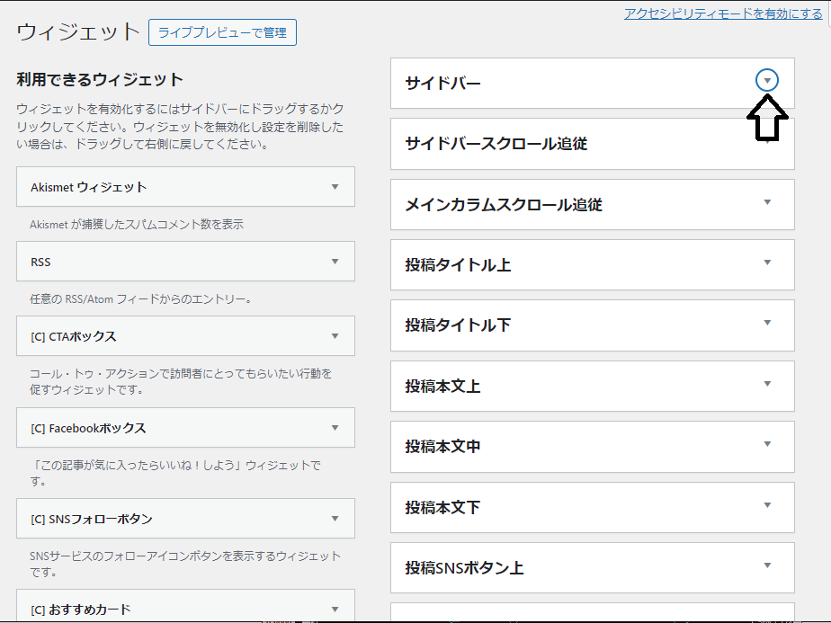 ワードプレス設定⑥(サイドバーの設定) ワードプレス奮闘記 2024.05.02 目次 サイドバーとは?サイドバー編集外観→ウィジェット サイドバーとは? サイドバーとは、ブログの右(テーマによっては左?)にある表示エリアといったところか。このエリアに任意の表示項目 プロフィール カレンダー カテゴリー表示 検索 最近の投稿 広告 などなど、定番も含めていろいろあるってことだね。 サイドバー編集 外観→ウィジェット 管理画面左のバーから外観>ウィジェットを選択。 サイドバーという項目の右上の〇をクリック 左にあるウィジェット一覧から細田バーに表示させたいものを選んでドラッグ&ドロップ